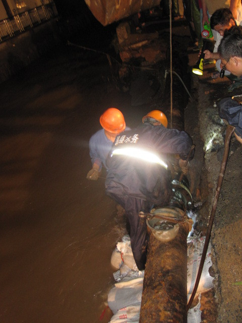 16點(diǎn)30分,紹興縣水務(wù)集團(tuán)接到稽東鎮(zhèn)政府搶險(xiǎn)救災(zāi)求助電話后,立即啟動(dòng)了大口徑管道應(yīng)急搶修預(yù)案,隨即成立了由集團(tuán)馮副總、供水公司總經(jīng)理李葉茂帶隊(duì),18名供水安裝搶險(xiǎn)人員組成的突擊搶修隊(duì),第一時(shí)間冒雨趕赴現(xiàn)場。
